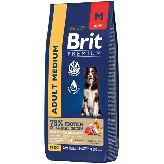 Корм для собак Корм сухой Brit Premium Dog Adult Medium для взрослых собак средних пород 10–25 кг, с индейкой и телятиной 15 кг
