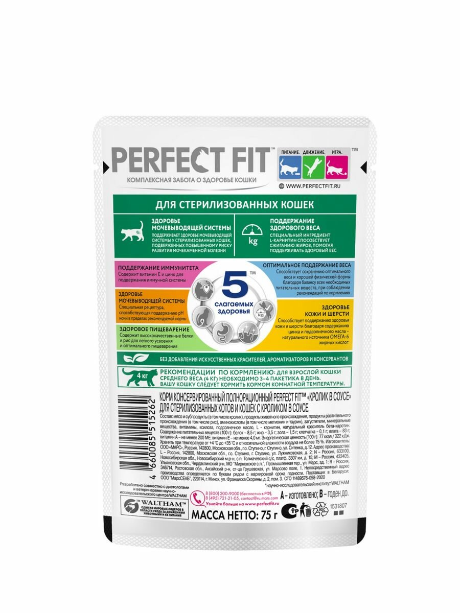 Корм для кошек Корм влажный Перфект Фит для Стерилизованных кошек Кролик в соусе 10 шт