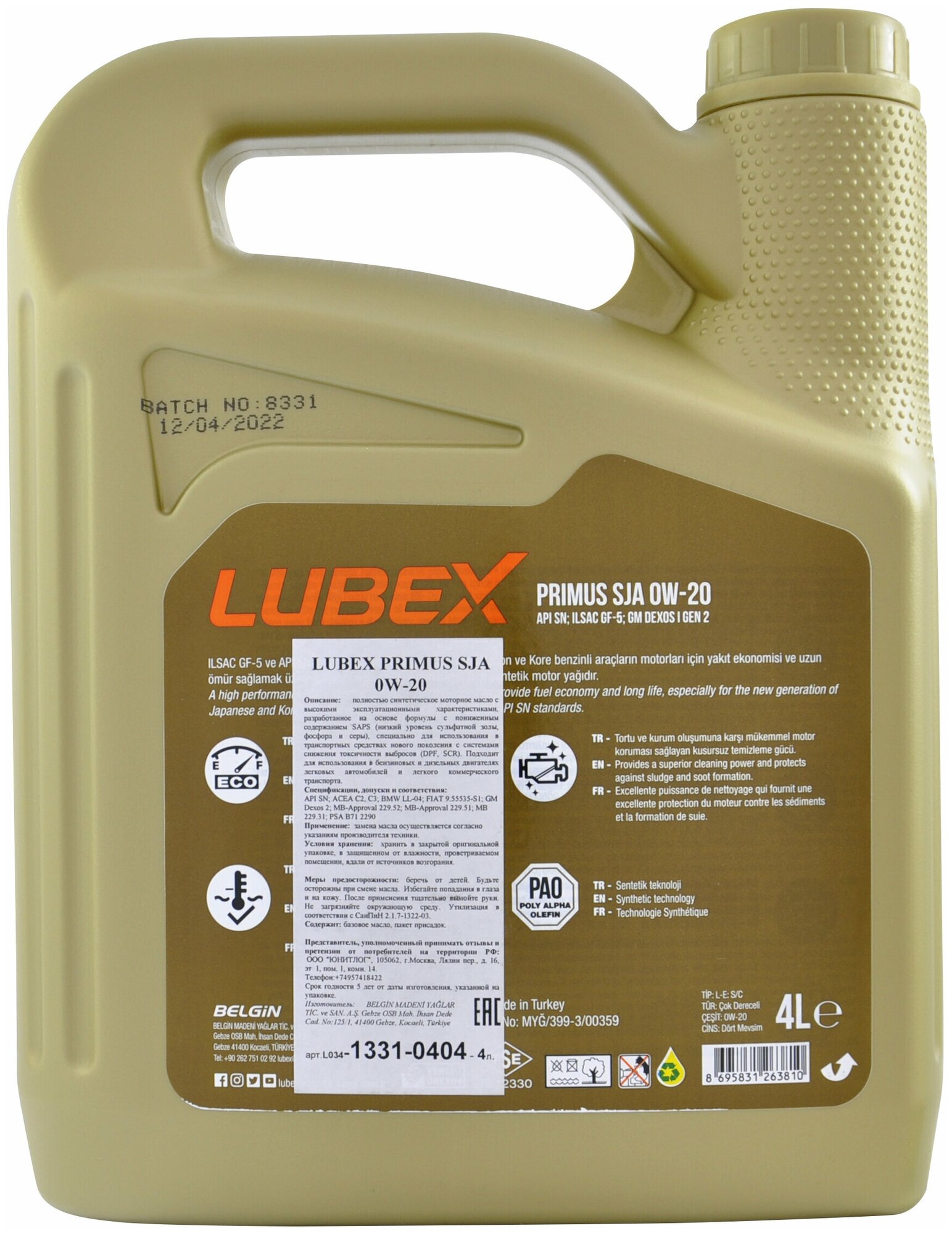LUBEX Масло Моторное Primus Sja 0W-20 Sn+Rc Gf-5 (4Л)