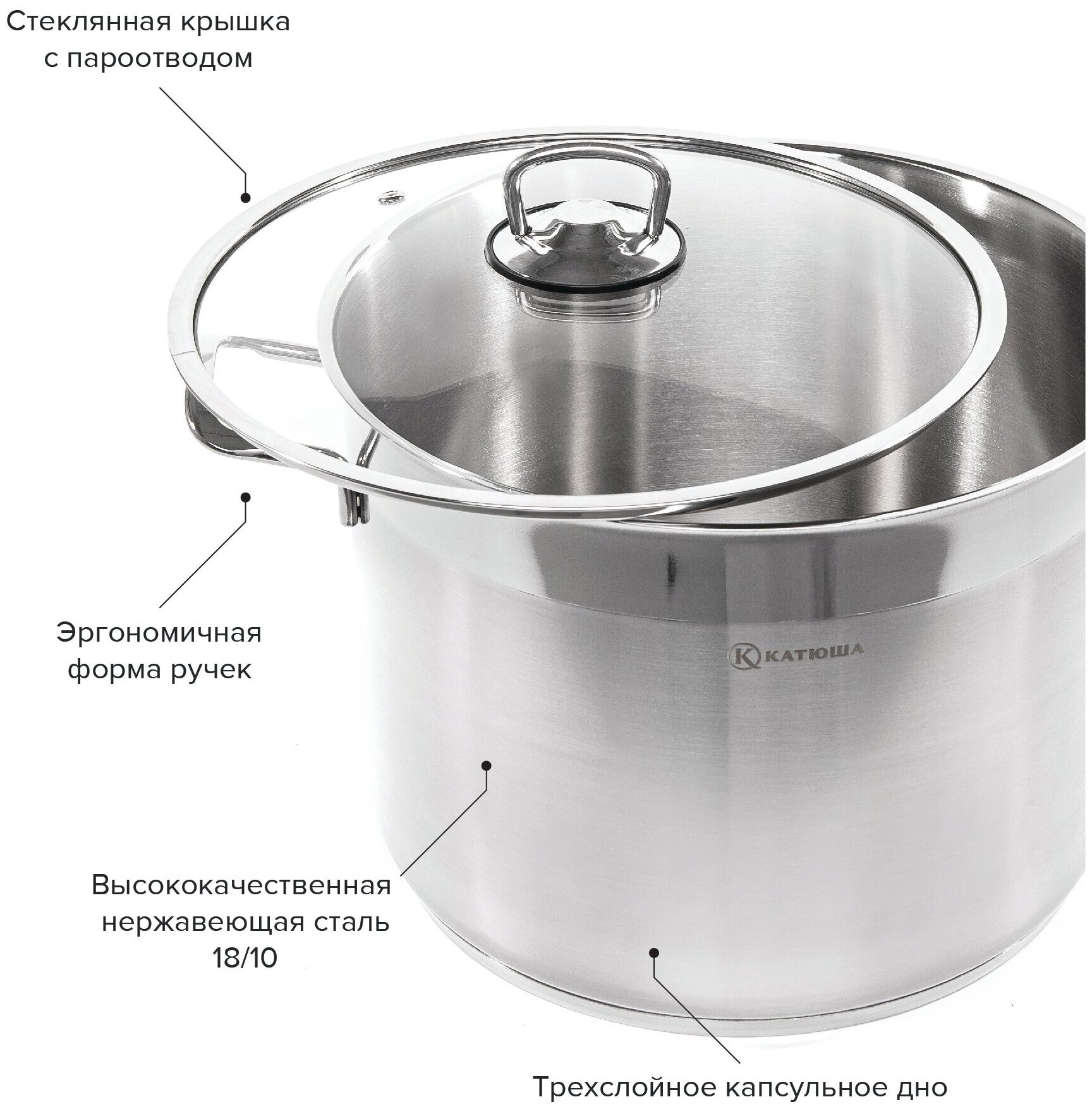 Кастрюля нержавеющая сталь, 26х20 см, 9.5 л, София, стеклянная крышка, катюша, арт. 9920-950-0