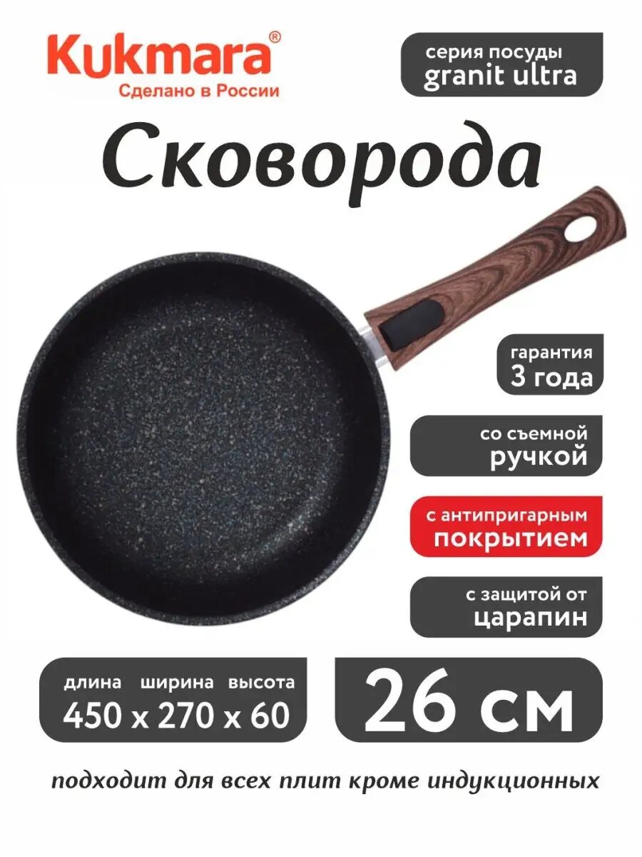 KUKMARA Сковорода Granit ultra, d=26 см, стеклянная крышка, съёмная ручка, антипригарное покрытие