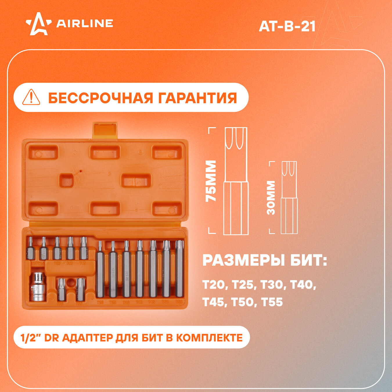 Набор бит вставок TORX 3/8" 30мм и 75мм с держателем бит 1/2" DR 15 предметов в кейсе AT-B-21 AIRLINE