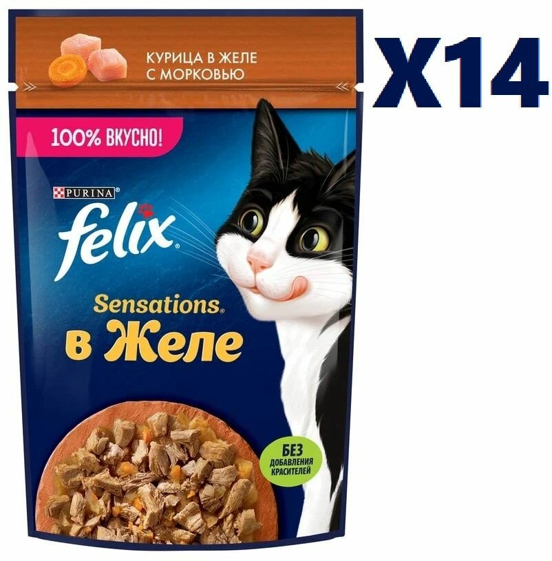 Корм для кошек Влажный корм Felix Sensations курица в желе с морковью для кошек 75г 14 шт