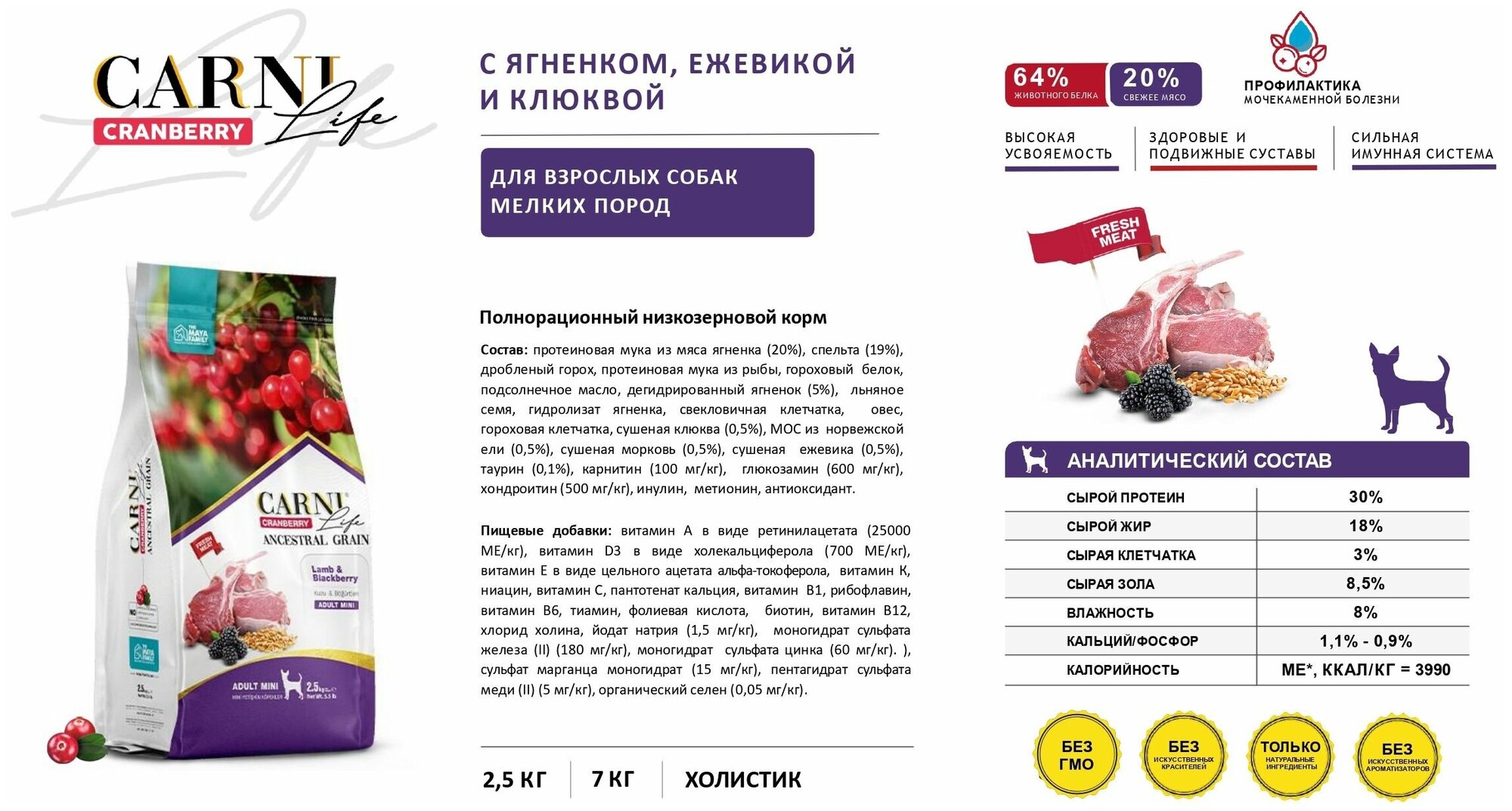 Сухой корм Carni Life Mini (Карни) для взрослых собак мелких пород с ягненком, ежевикой и клюквой, 2,5 кг