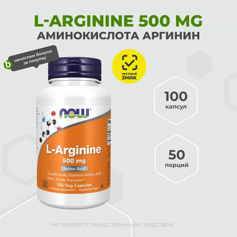 NOW L-Arginine, Аргинин, 500мг 100 растительных капсул, веган, Аминокислоты для похудения, для набора мышечной массы, для обмена веществ 1 359 ₽ Подробнее