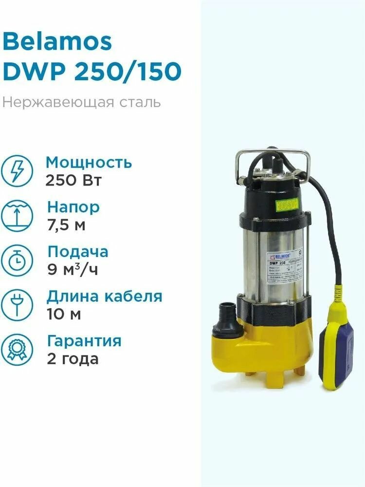 Погружные (дренажные) насосы Насос дренажный Belamos DWP 250/150л. мин., кабель 10м, Н 7,5м. погружной с измельчителем.DWP 250