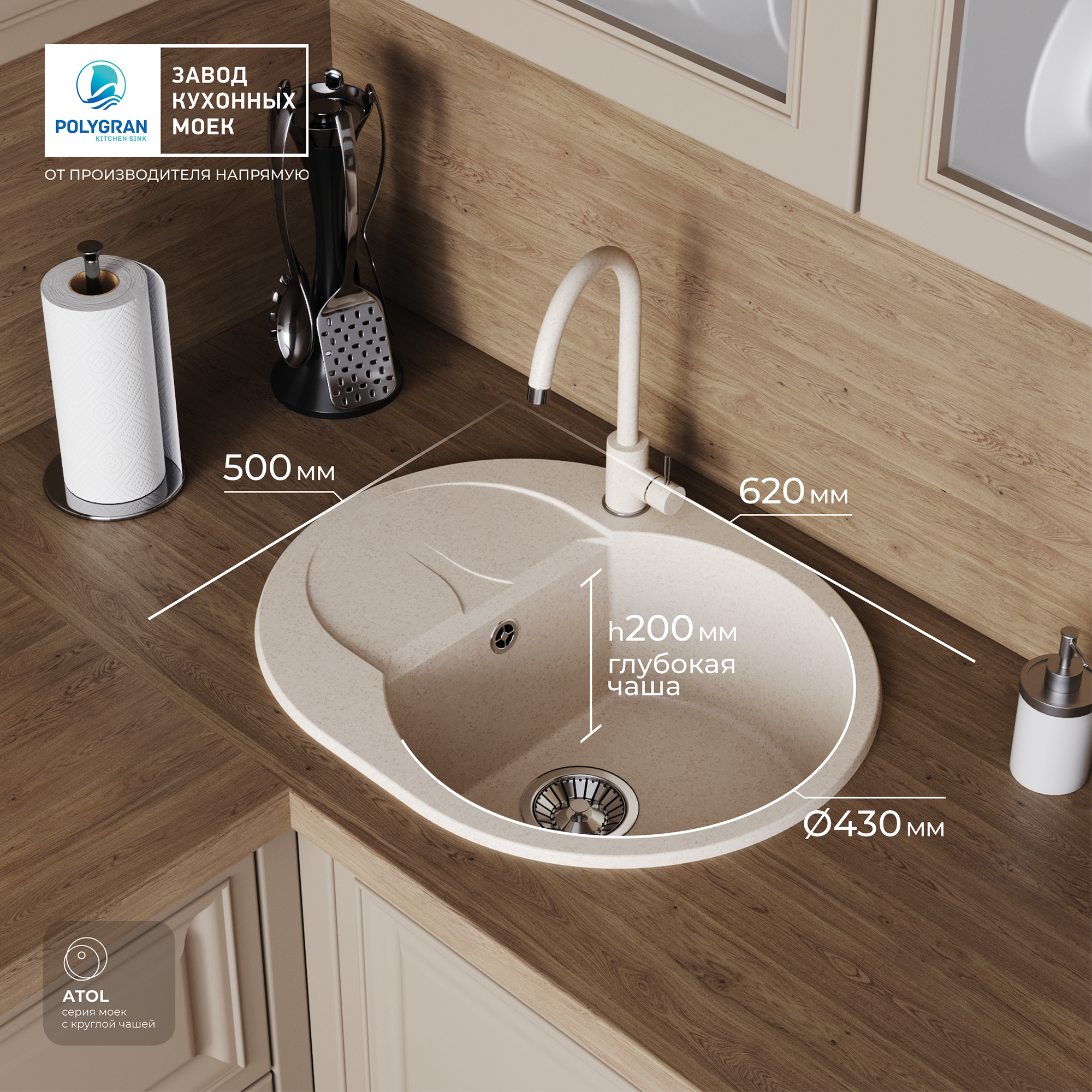 Мойка для кухни каменная POLYGRAN ATOL-620, бежевая, врезная, круглая, с крылом (№327 Кремовый) 7 200 ₽ Подробнее
