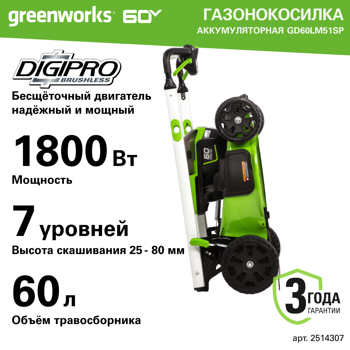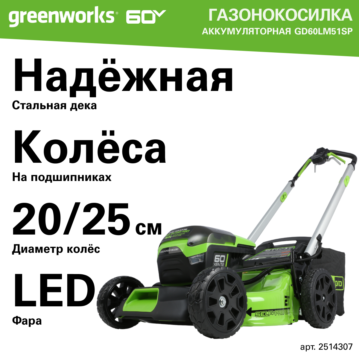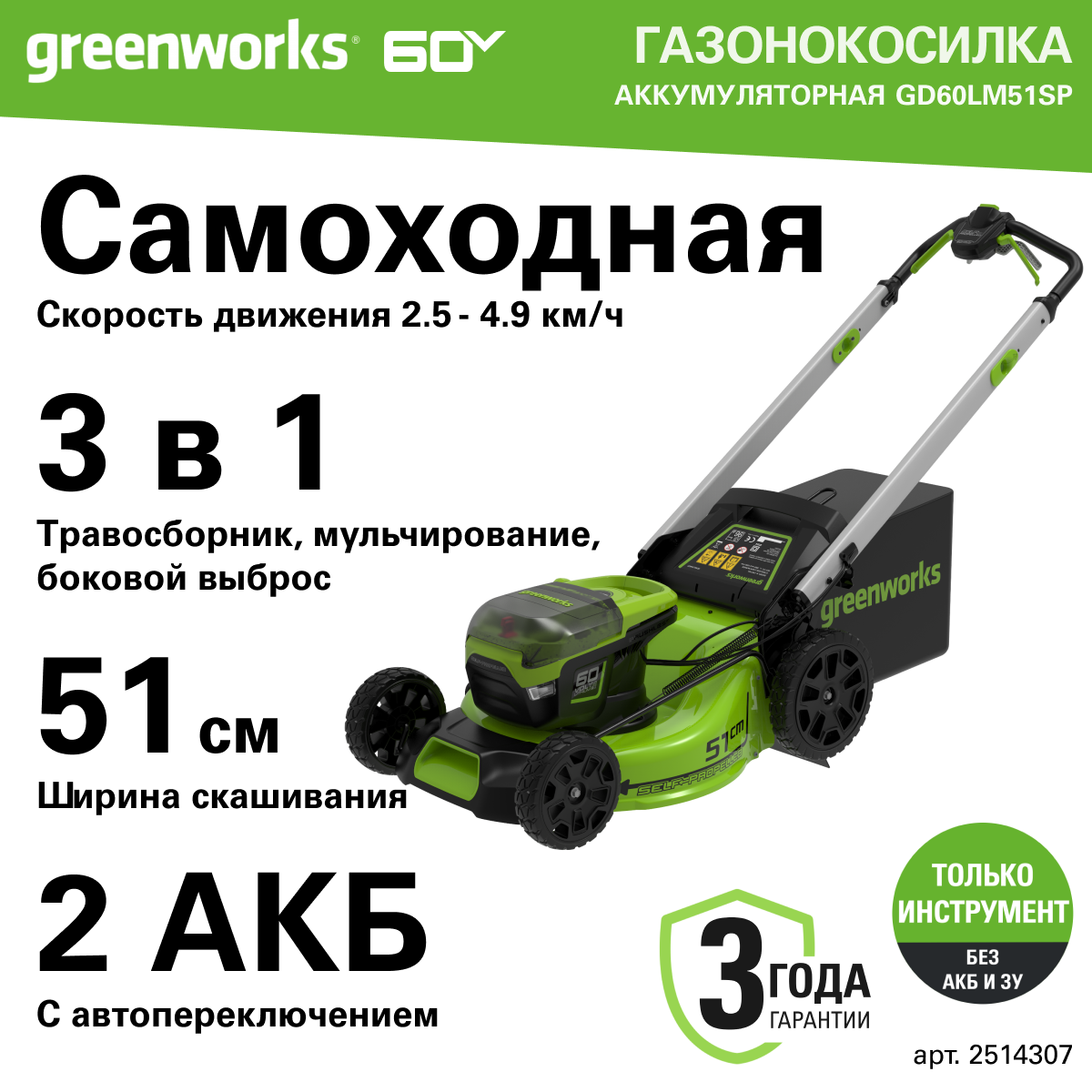 Газонокосилка Газонокосилка самоходная, аккумуляторная Greenworks Арт. 2514307, 60V, 51 см, самоходная, бесщеточная, без АКБ и ЗУ