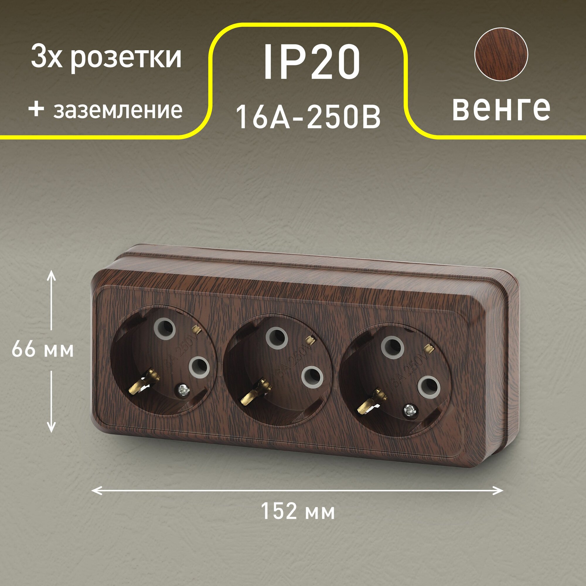 Розетка Розетка Intro Quadro 2-206-10 с заземлением трехместная 3х2P+E 16А-250В IP20 открытой установки венге