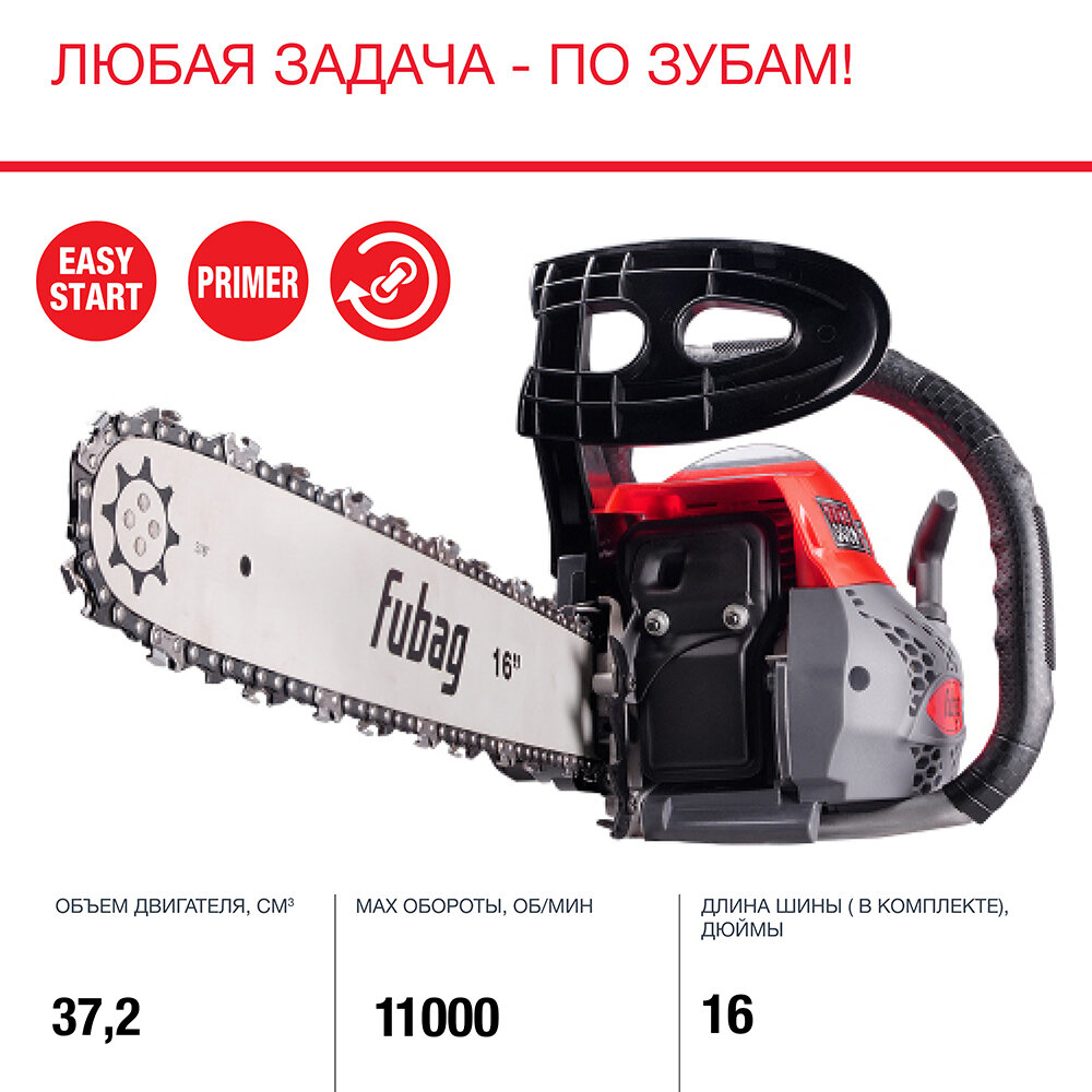 Пилы Бензопила цепная бензиновая FUBAG FPS 37, мощность 1,5 кВт/2,0 л.с., объем двигателя 37 см3, шина 16 дюймов, кол-во звеньев 57