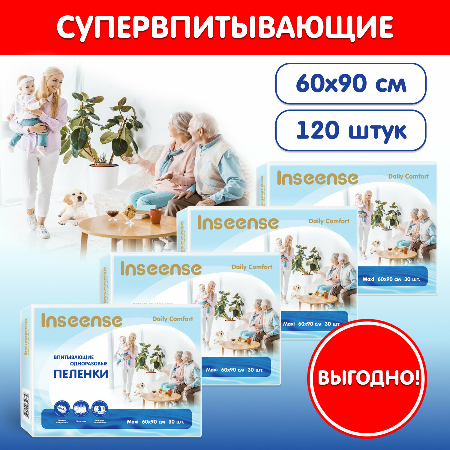 Подгузники Пеленки одноразовые 60х90 INSEENSE Daily Comfort, 4 упаковки по 30 шт