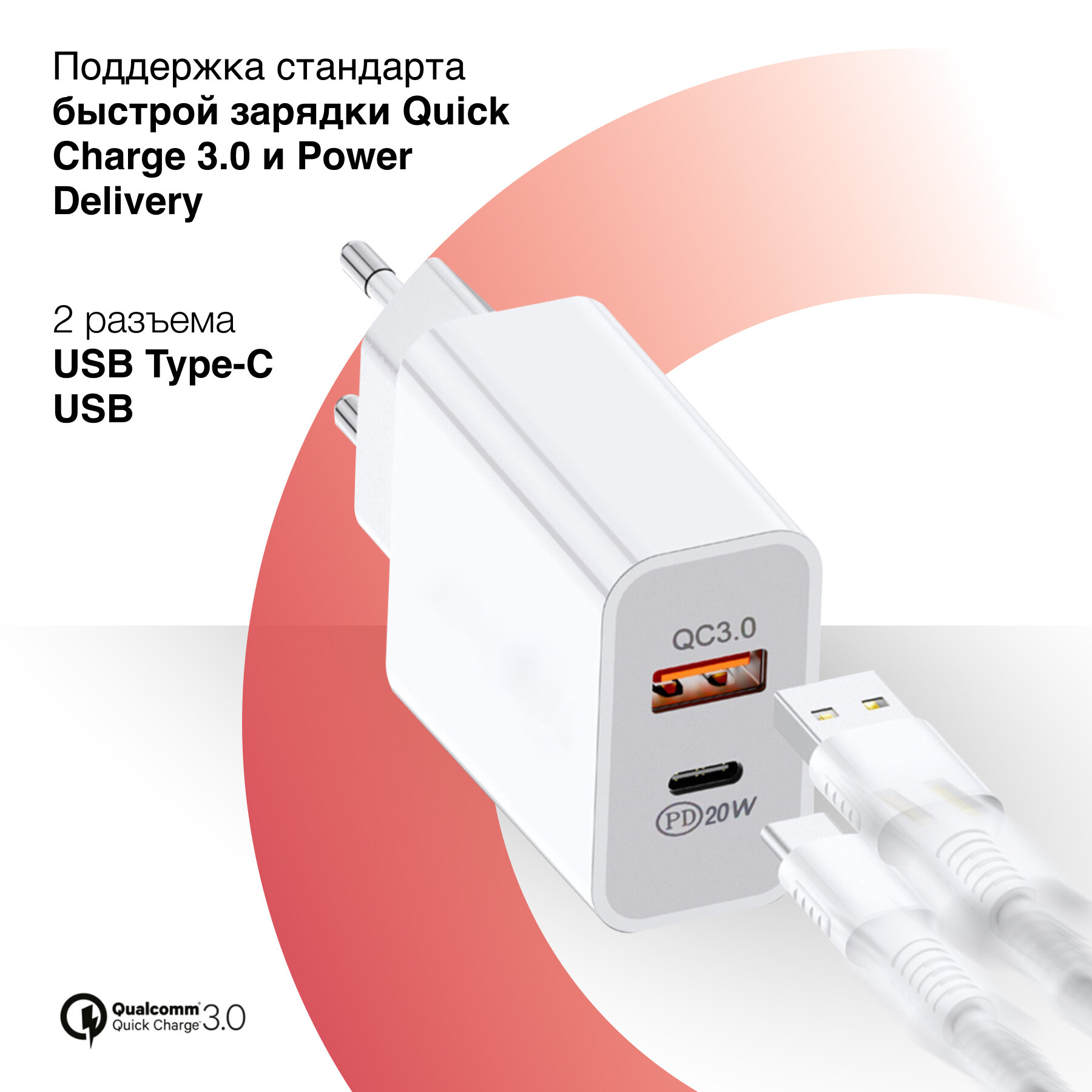 Сетевой адаптер с быстрой зарядкой PD+QC3.0 20W, USB-C + USB-A