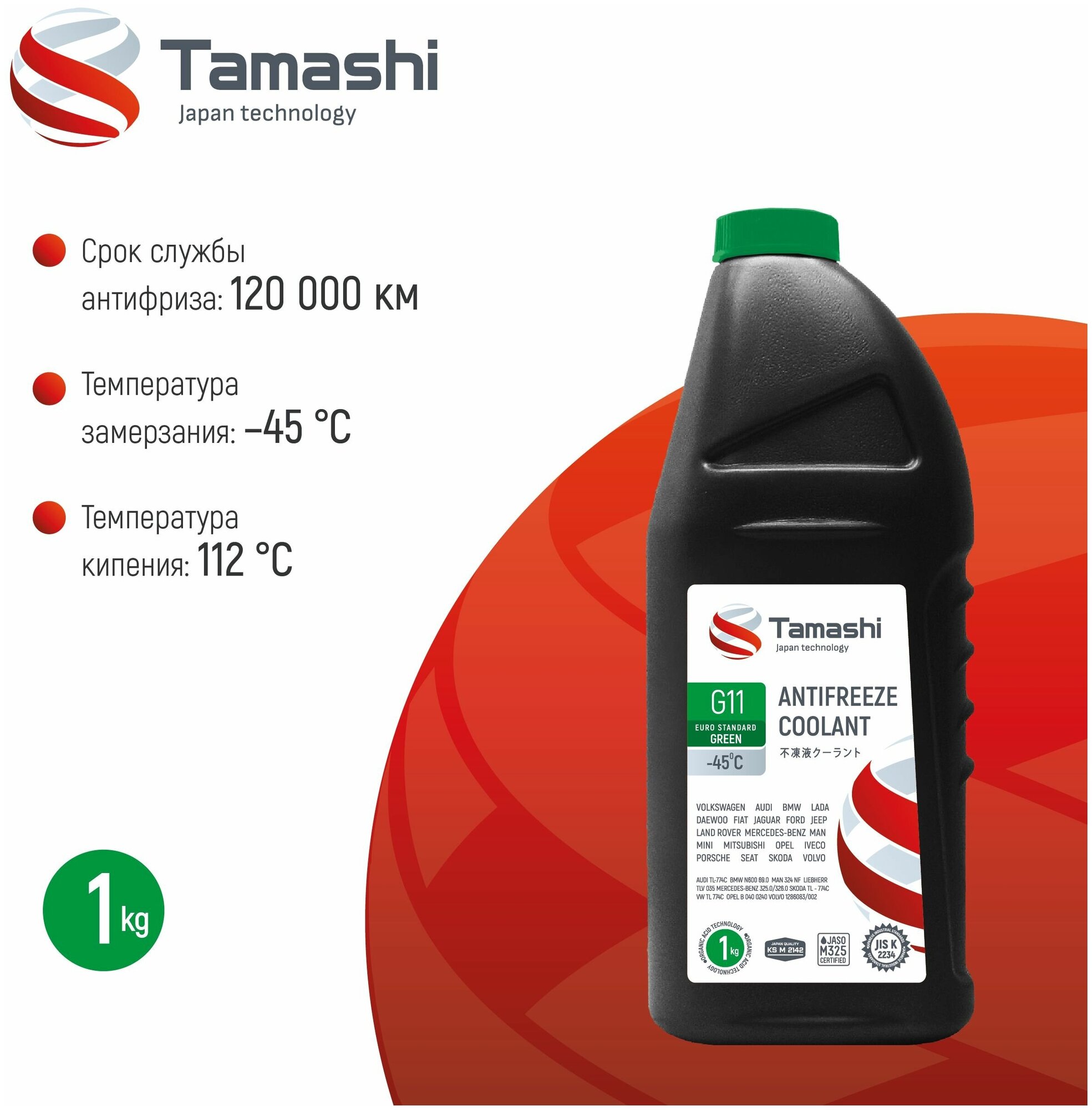 Охлаждающая жидкость Антифриз TAMASHI G11 EURO STANDARD GREEN, -45 C, 1кг, Зеленый