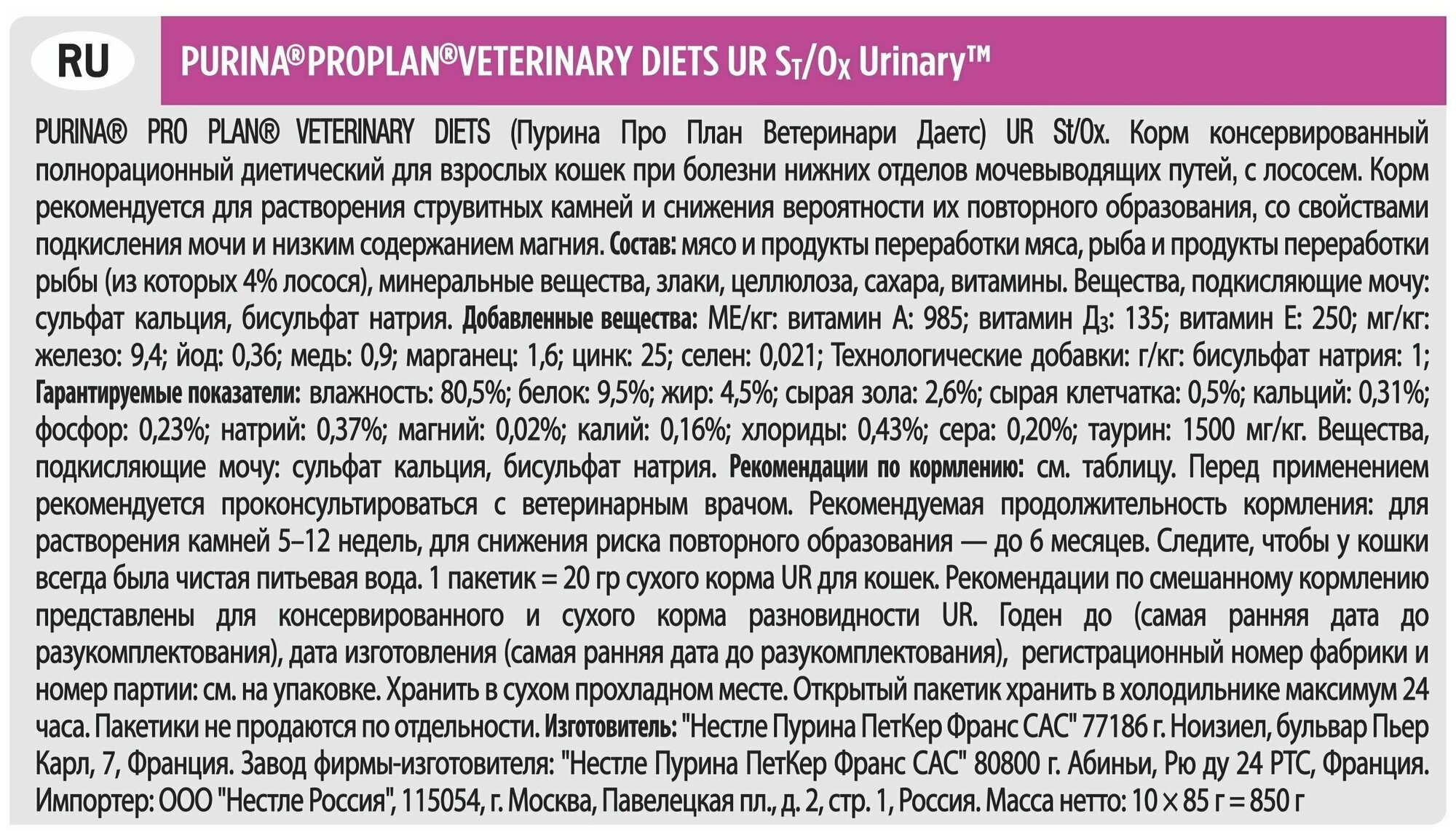 PRO PLAN VETERINARY DIETS UR ST/OX URINARY для взросл кошек при мочекам бол с лососем пауч 85 гр NEW 85 гр х 10 шт