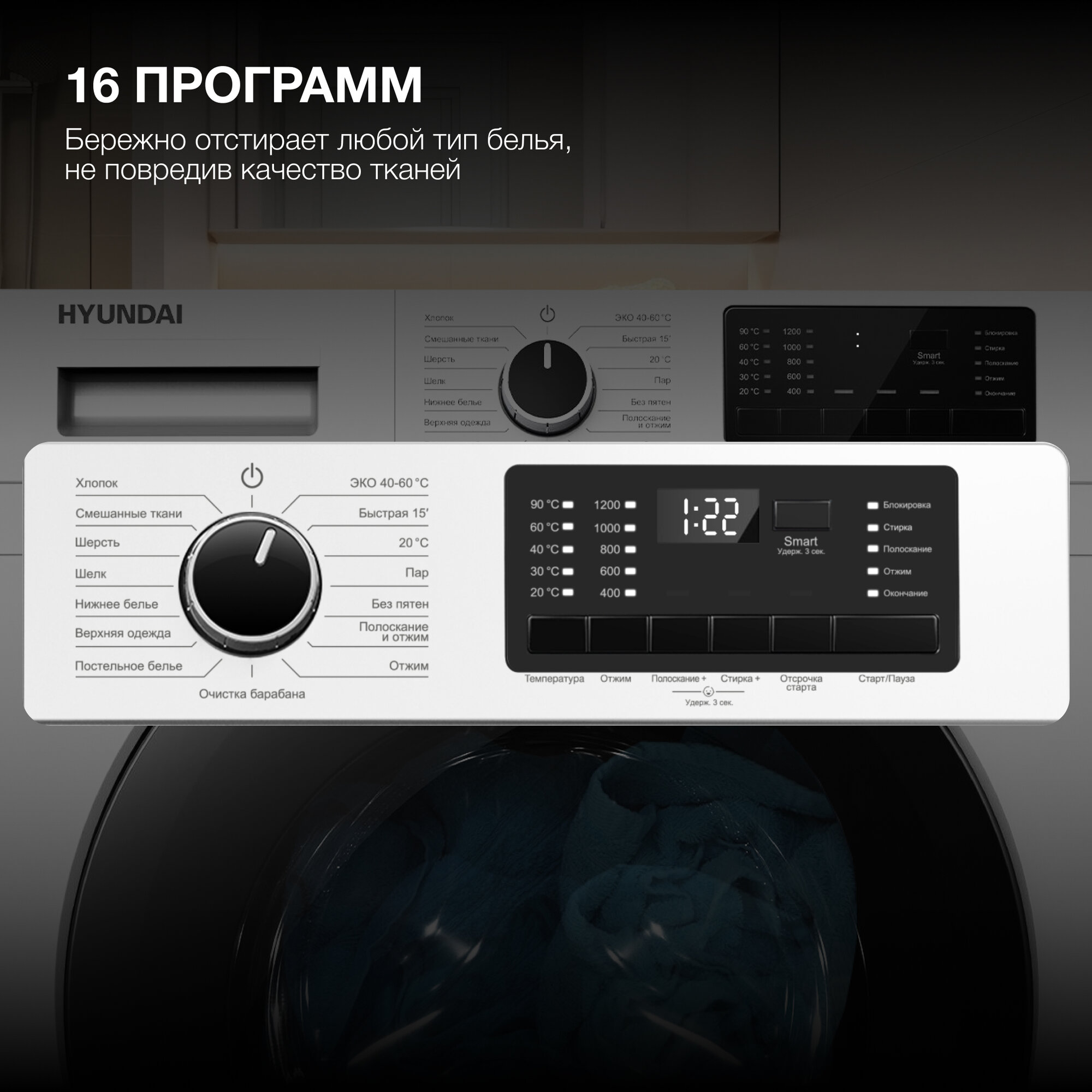 Стиральная машина Стиральная машина Hyundai WFE9201, глубина 60 см, загрузка 10 кг, с функцией Пар, электронно-механическое управление, 1200 оборотов, 16 программ, блокировка от детей, быстрая стирка 15 мин., отсрочка старта, белый