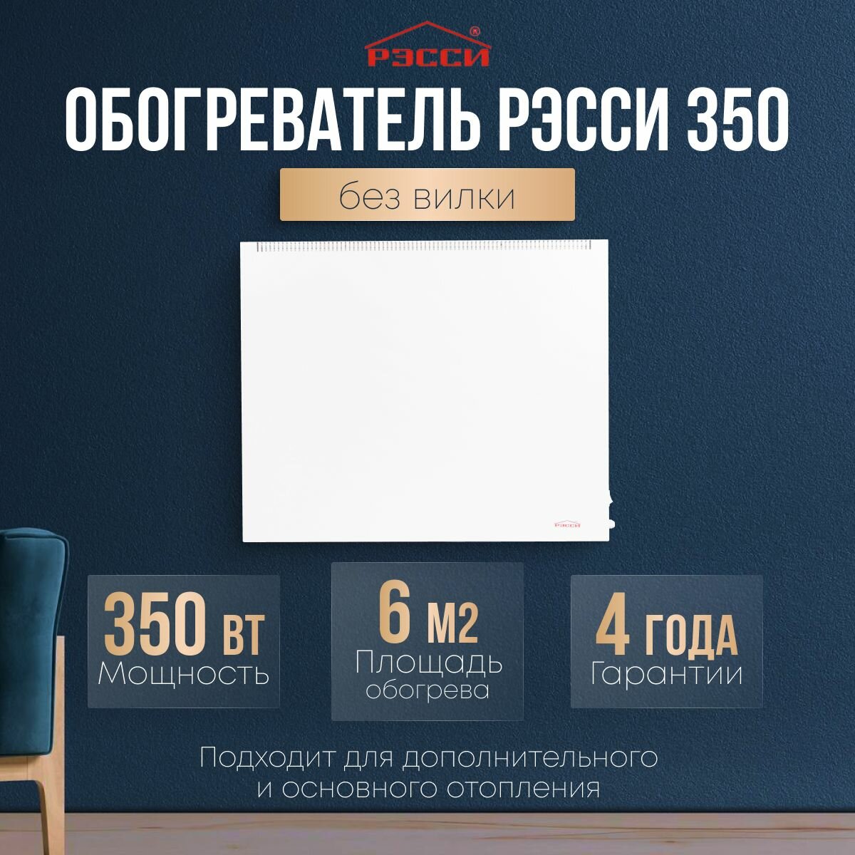 Обогреватель Рэсси 350 (6 кв. м.), белый, энергосберегающий конвектор, без вилки