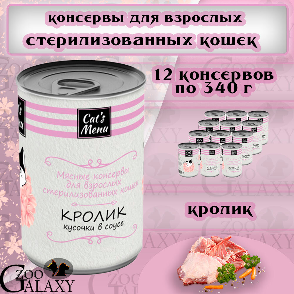Cat's Menu Консервы для взрослых стерилизованных кошек с кроликом, кусочки в соусе, 340 г