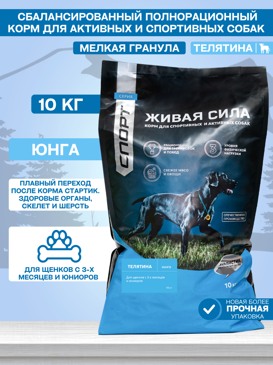 Корм для собак Живая сила Спорт, Юнга корм для щенков всех пород от 3 месяцев с телятиной и рыбой, Крупная гранула (10 кг)