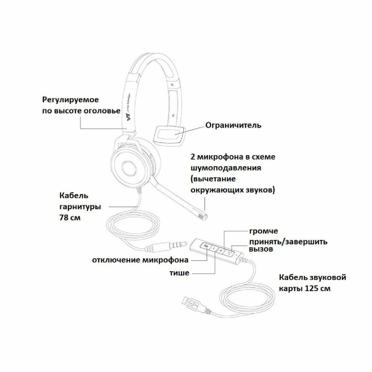 Наушники Головная гарнитура VT X208, Моно, HD звук, разъемы 3,5 мм Jack и USB