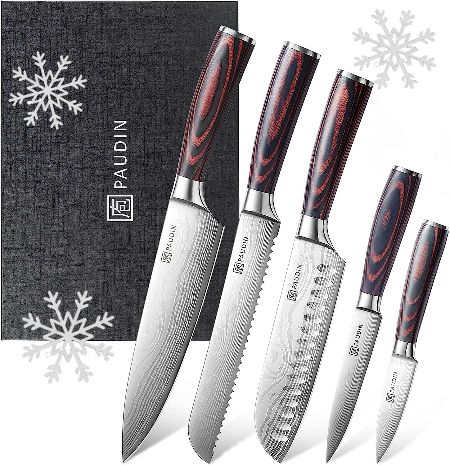 Кухонные ножи Набор ножей кухонных профессиональных шеф повара, сантоку, для хлеба, универсальный и фруктовый для мяса рыбы и овощей комплект 5 шт. Подарок на Новый год и Рождество