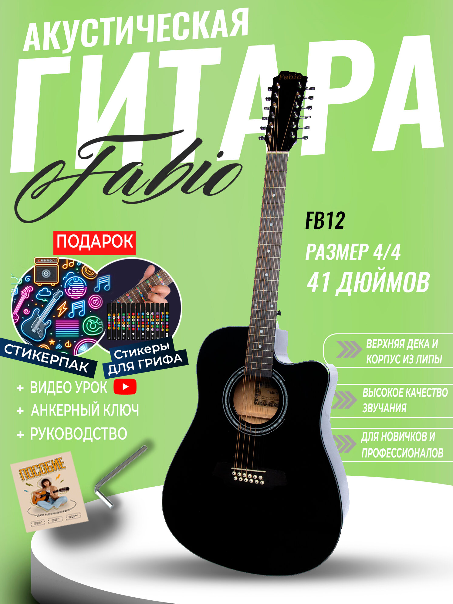 Акустические гитары Двенадцатиструнная акустическая гитара Fabio 4120 FB12, с вырезом, матовая, чёрная