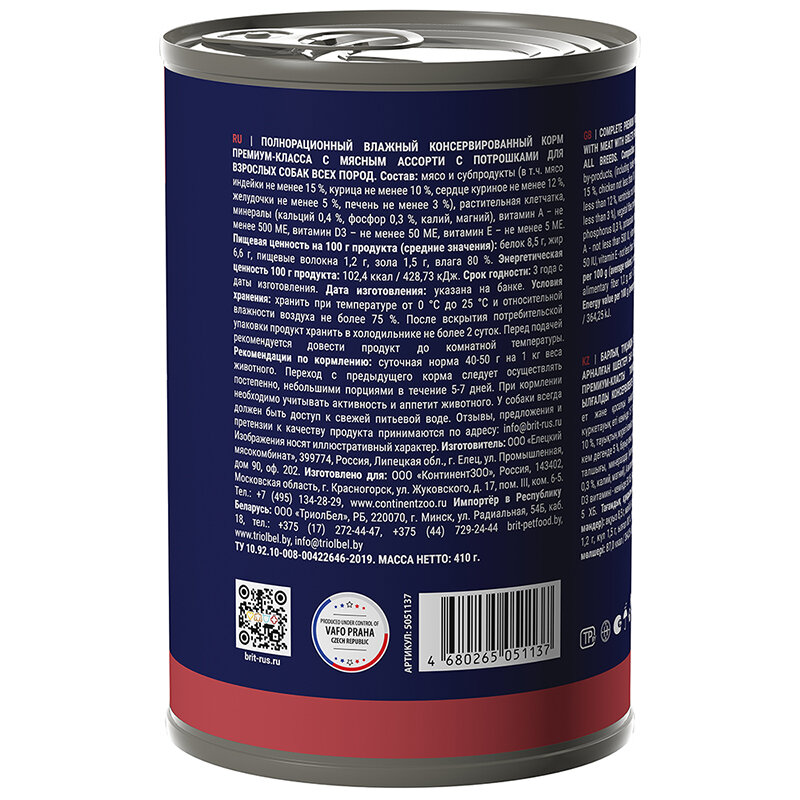 Брит Премиум by Nature 410г мясное ассорт.потрошки консервы для собак всех пород 1шт