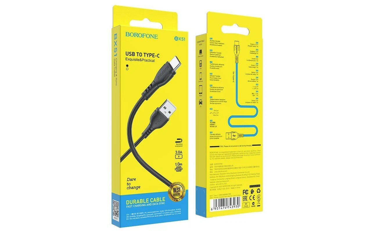 USB-кабель BOROFONE BX51 AM-Type-C 1 метр, 3А, пластик, чёрный (34) 6931474743930