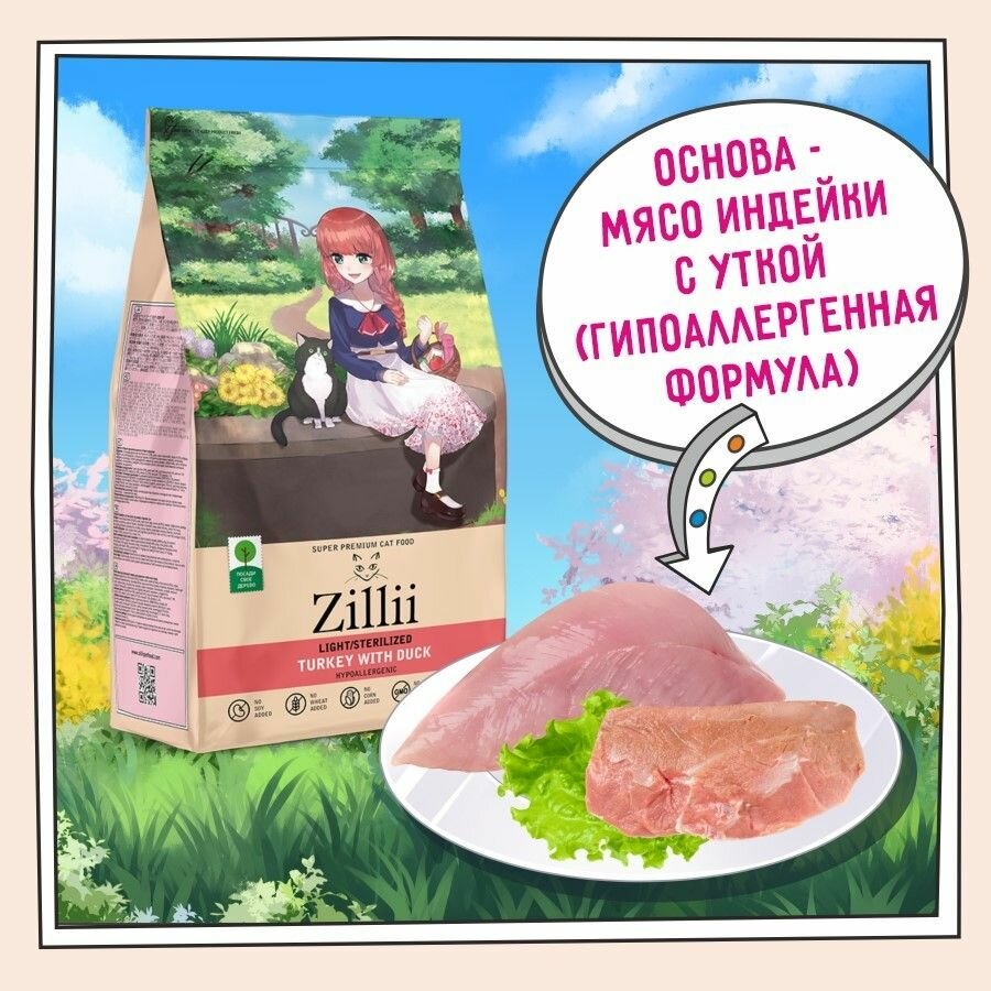 Корм для кошек ZILLII (Зилли) Light/Sterilized Cat Корм сухой для взрослых кошек с избыточным весом и стерилизованных 2 кг Индейка с Уткой, гипоаллергенный