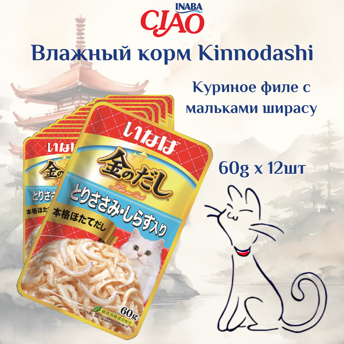 Корм для кошек Корм для кошек влажный INABA KINNODASHI Куриное филе и мальки ширасу в желе, пауч 60г, 12 шт.
