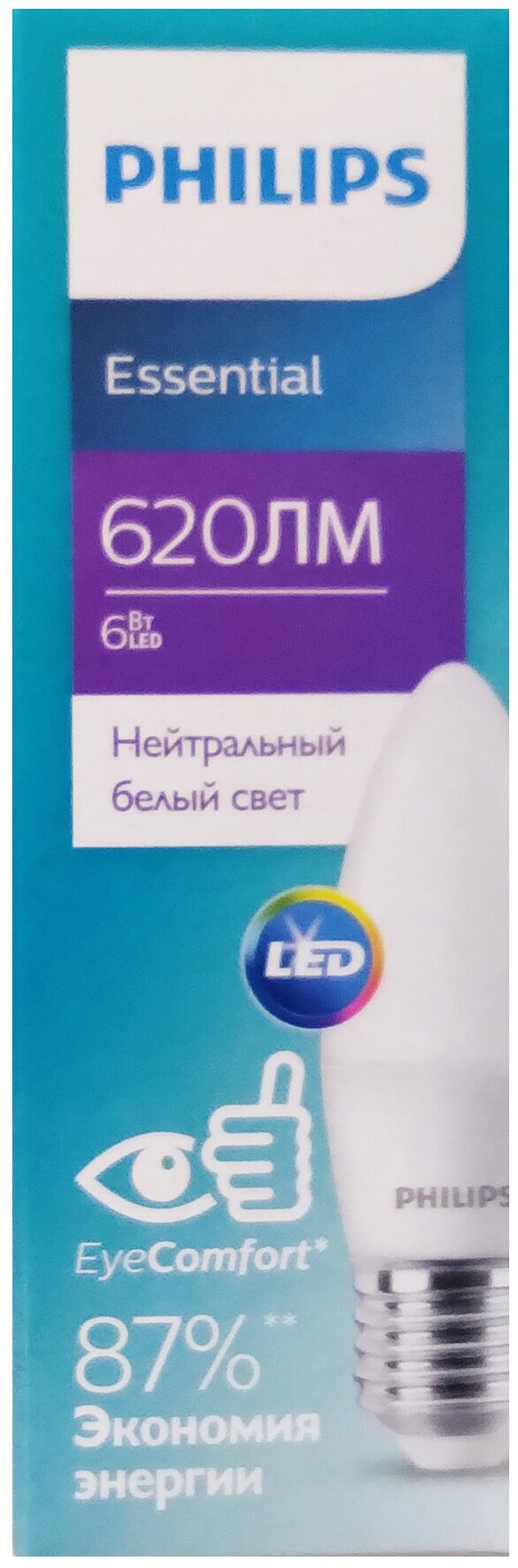 Лампа Светодиодная Свеча 6W 220V E27 620Лм D-35mm L-140mm 4000К Свет Нейтральный белый Philips, уп. 12шт