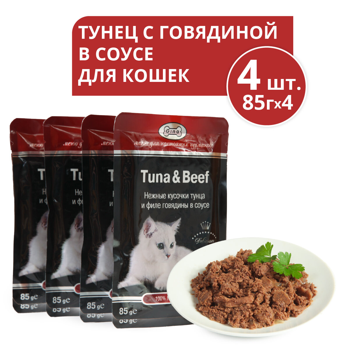 Корм для кошек Корм для кошек консервированный Gina Tuna & Beef, тунец с говядиной в соусе, пауч 85 г (4 шт.)