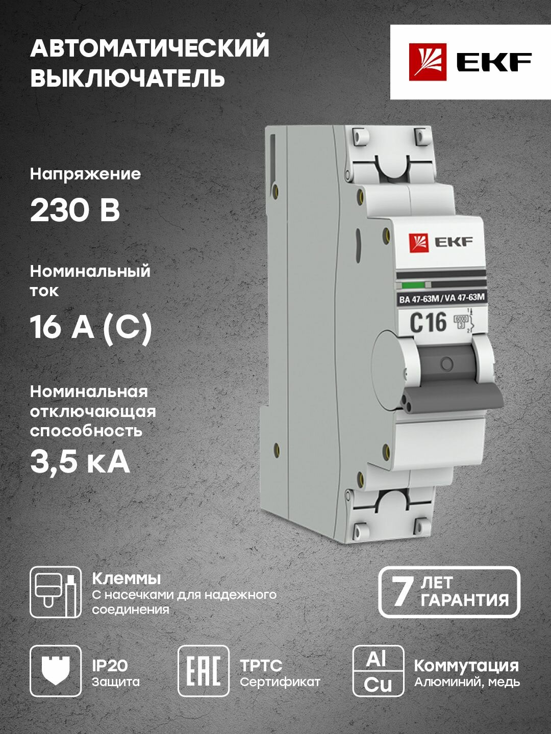 Выключатели Автоматический выключатель 1P 16А (C) 6кА ВА 47-63M без теплового расцепителя, EKF PROxima