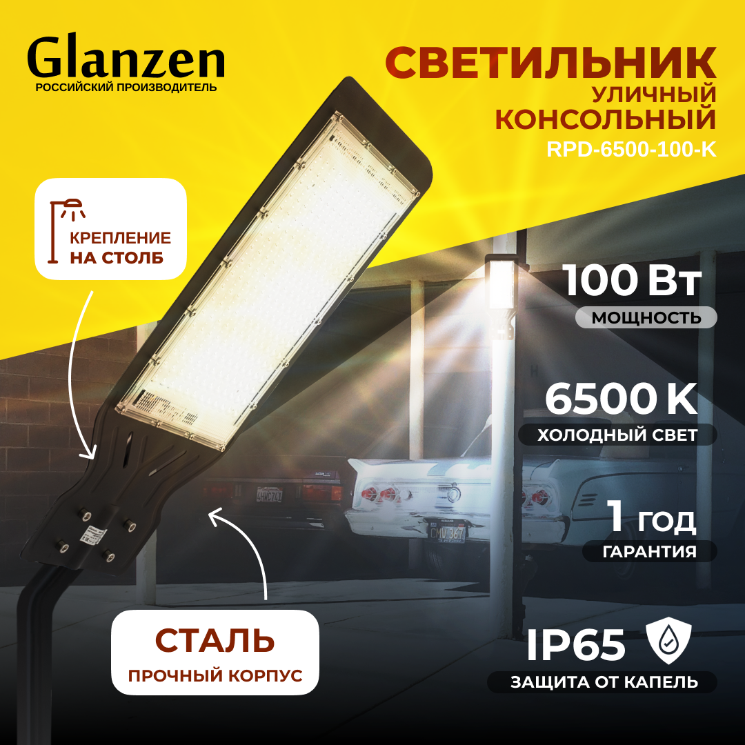 Светодиодный консольный светильник GLANZEN 100W RPD-6500-100-k 6500K IP65