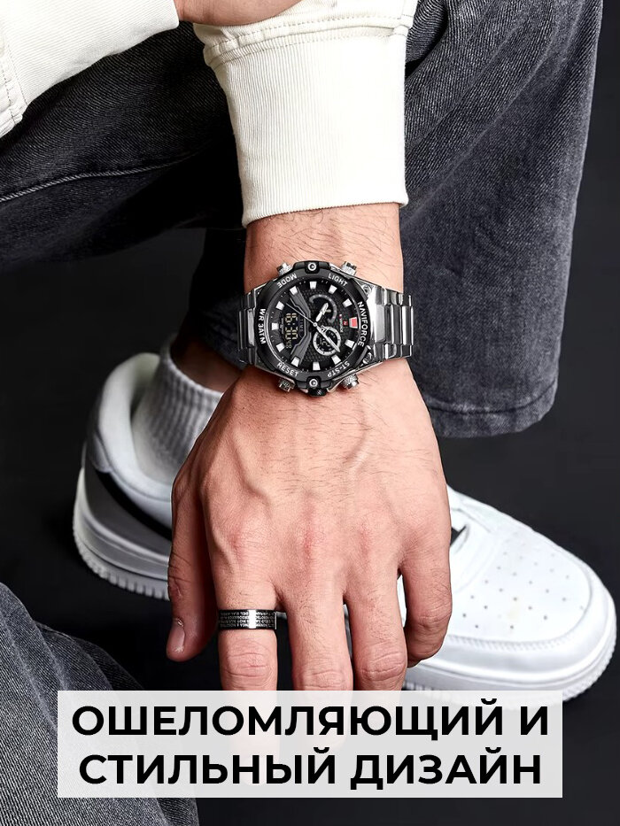 Наручные часы Часы наручные мужские электронные кварцевые Naviforce металлические, с секундомером и подсветкой, серебристые/черные