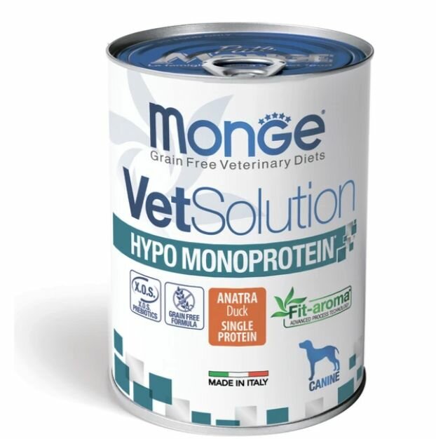 Корм для собак Корм влажный для собак Monge VetSolution Dog Hypo Monoprotein DUCK, ветеринарная диета, гипо монопротеин с уткой, для снижения реакции пищевой непереносимости, консервы 12 ш x 400г