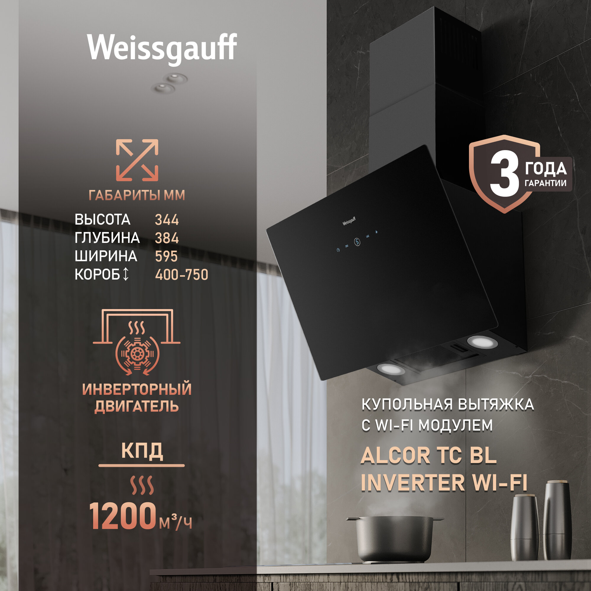 Вытяжки Купольная вытяжка c Wi-Fi и инвертором Weissgauff Alcor TC BL Inverter Wi-Fi, Алюминиевый жировой фильтр