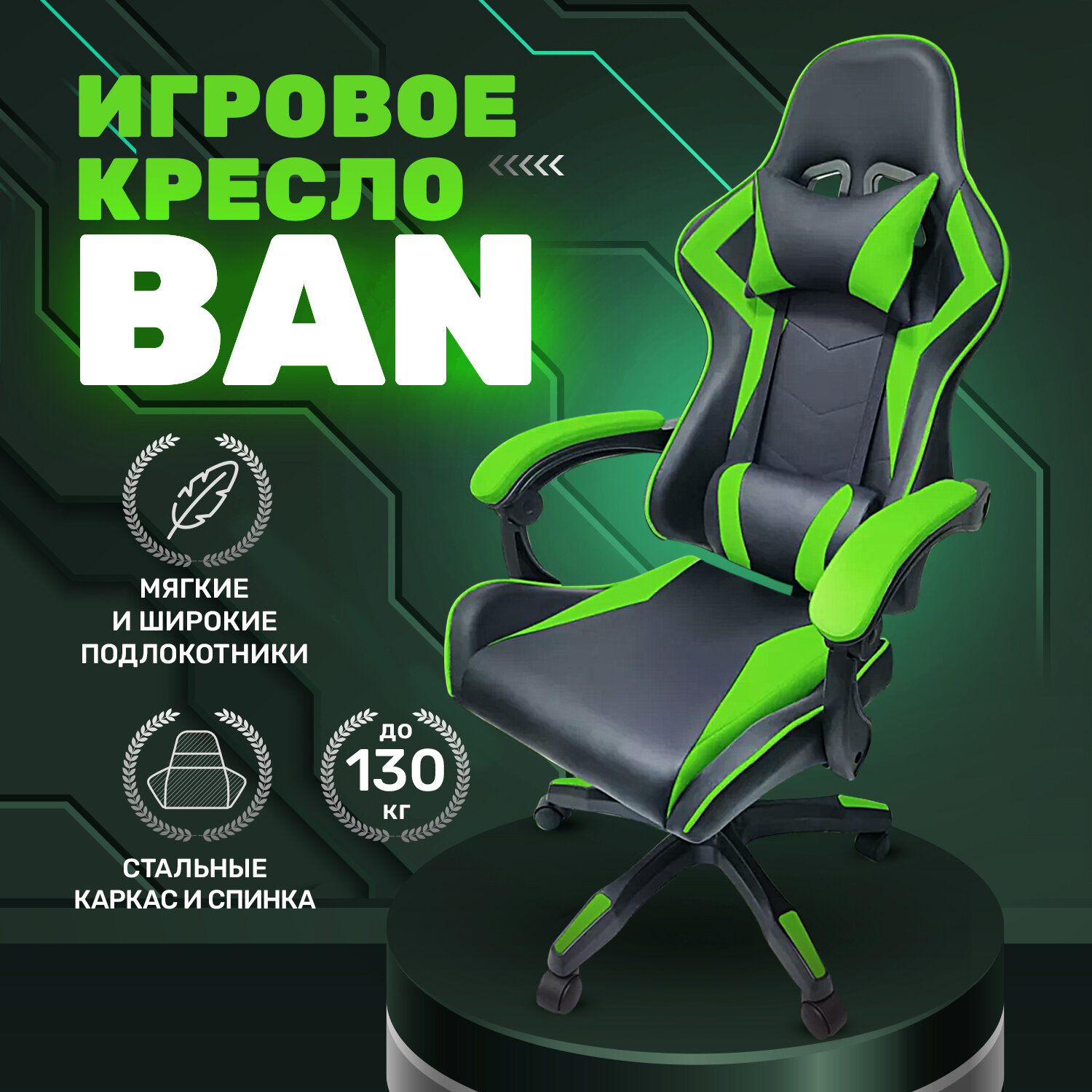 Компьютерные кресла Игровое геймерское кресло на колесиках BYROOM Game BAN green HS-5010-GR кожаное крутящееся. Компьютерный стул для геймера с ортопедической высокой спинкой для игр и работы на пк