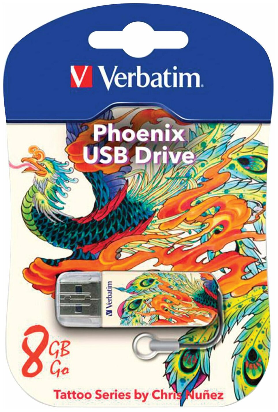 USB Flash (флешка) Флэш-диск 8 GB, VERBATIM Mini Tattoo Edition Phoenix, USB 2.0, белый с рисунком, 49883 511647