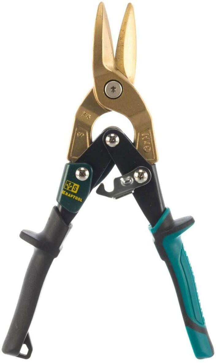Лучшие цены. Ножницы по металлу Kraftool 2327-S предназначены для резки стальных листов. Длина инструмента составляет 250 мм. Двойная рычажная передача повышает эффективность работы вдвое. Губки прямые, а режущие кромки имеют насечки для предотвращения проскальзывания. Движение, противоположное резу, выполняется благодаря возвратной пружине. В нерабочем состоянии предусмотрена блокировка лезвий. Двухкомпонентные рукоятки имеют эргономичную форму, обеспечивают удобство работы и надежность хвата. Магазины в вашем городе.