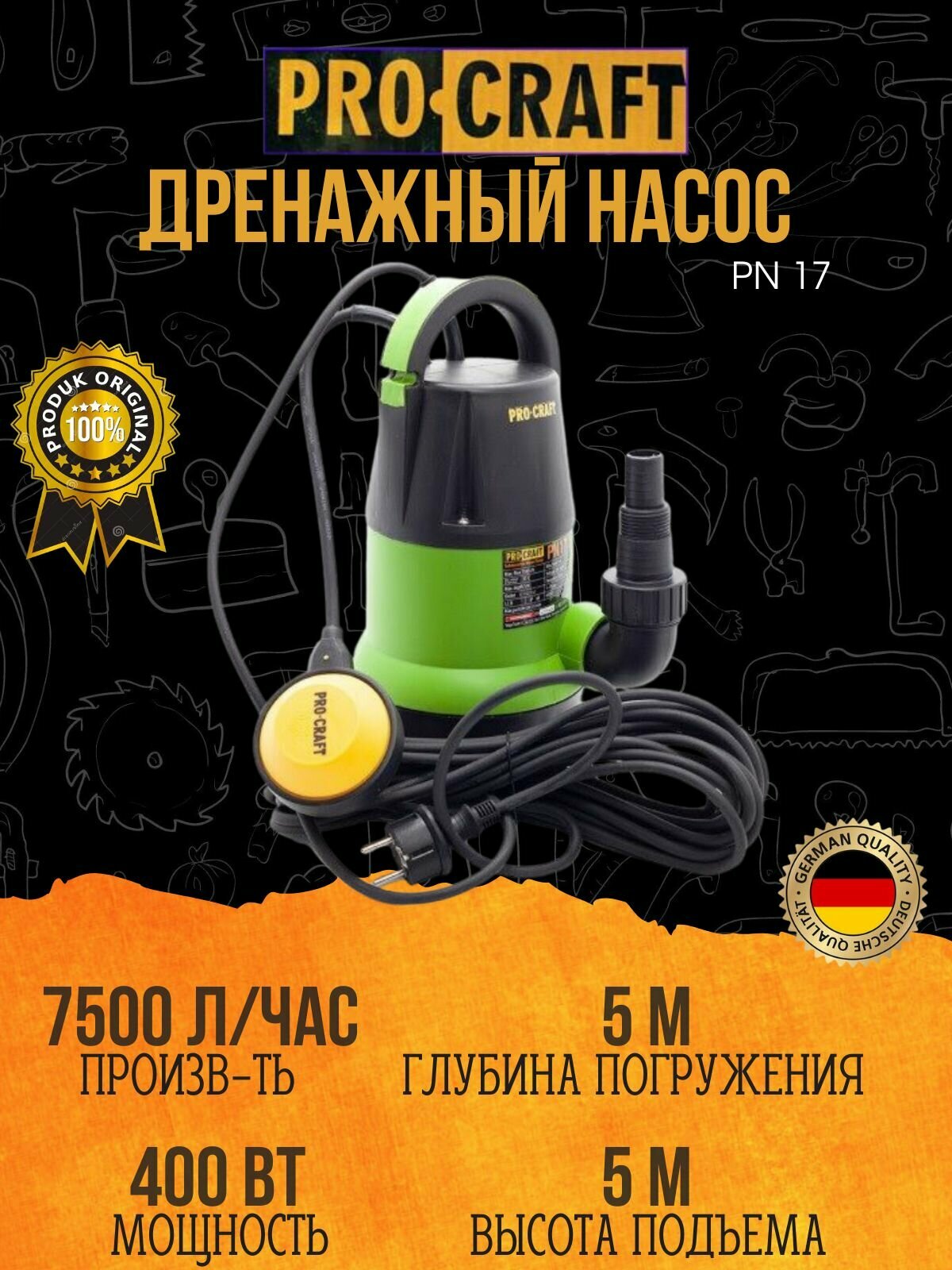 Погружные (дренажные) насосы Дренажный насос с поплавковым выключателем Procraft PN17 (погружение 5м)