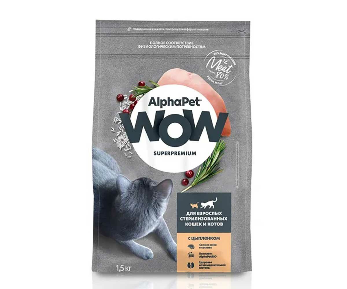 Корм для кошек Сухой корм AlphaPet wow для стерилизованных кошек цыпленок 1,5кг 50877