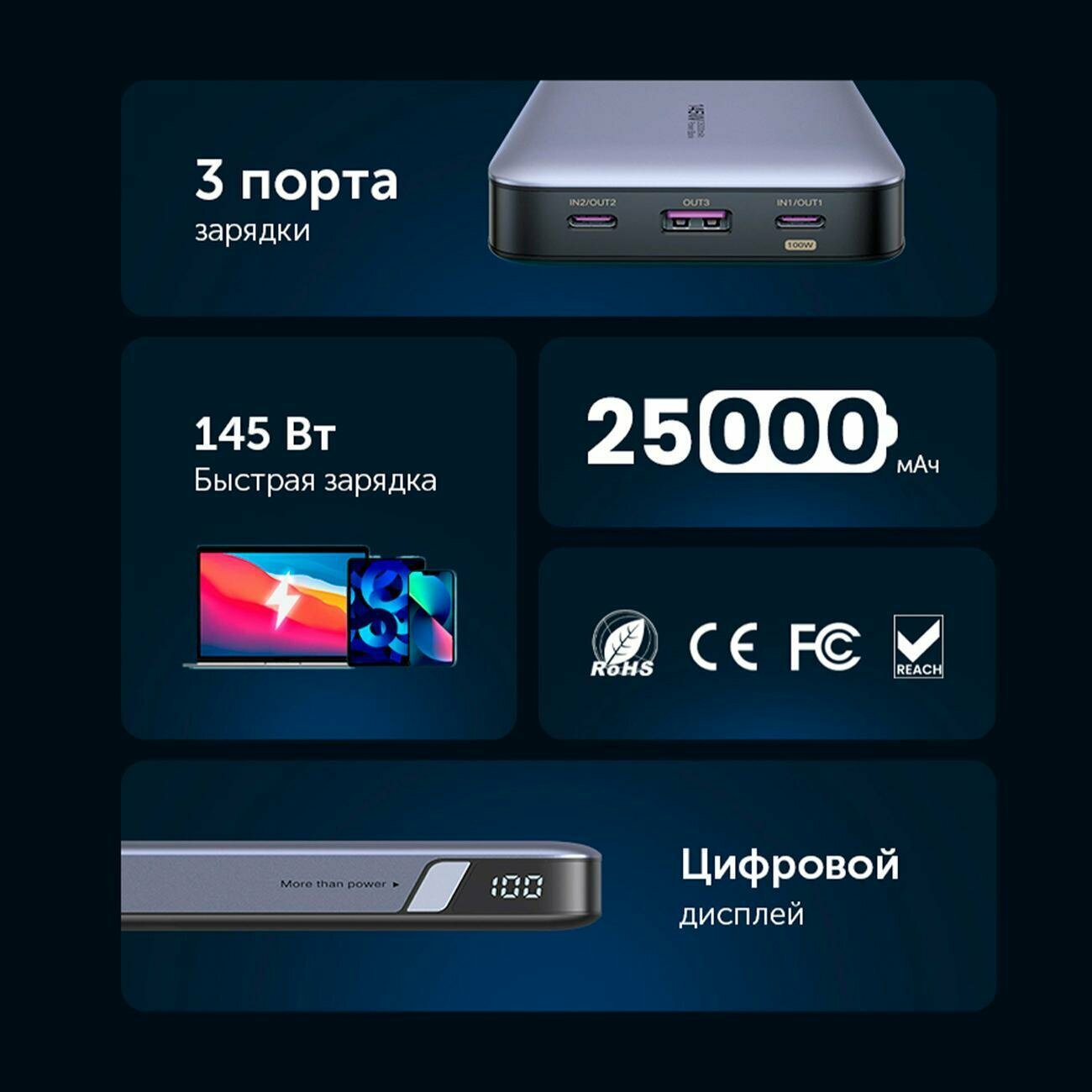 Powerbank Портативный аккумулятор Ugreen PB205, 25000мАч, 3 выходных разъема, 145Вт
