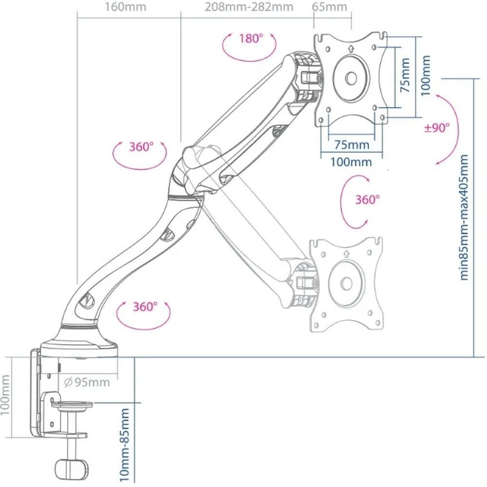 Лучшие цены. Многофункциональный - монитор на кронштейне можно поворачивать вокруг совей оси на 360°, наклонять вверх и вниз, придвигать или удалять от себя. Встроенная газовая пружина обеспечивает плавное и лёгкое движение экрана вверх и вниз в пределах 325 мм, а также фиксацию монитора в любом промежуточном положении. Надежная алюминиевая конструкция. Встроенная система скрытой укладки соединительных кабелей. Два варианта установки на столешницу: за край стола и на поверхность стола. Магазины в вашем городе.