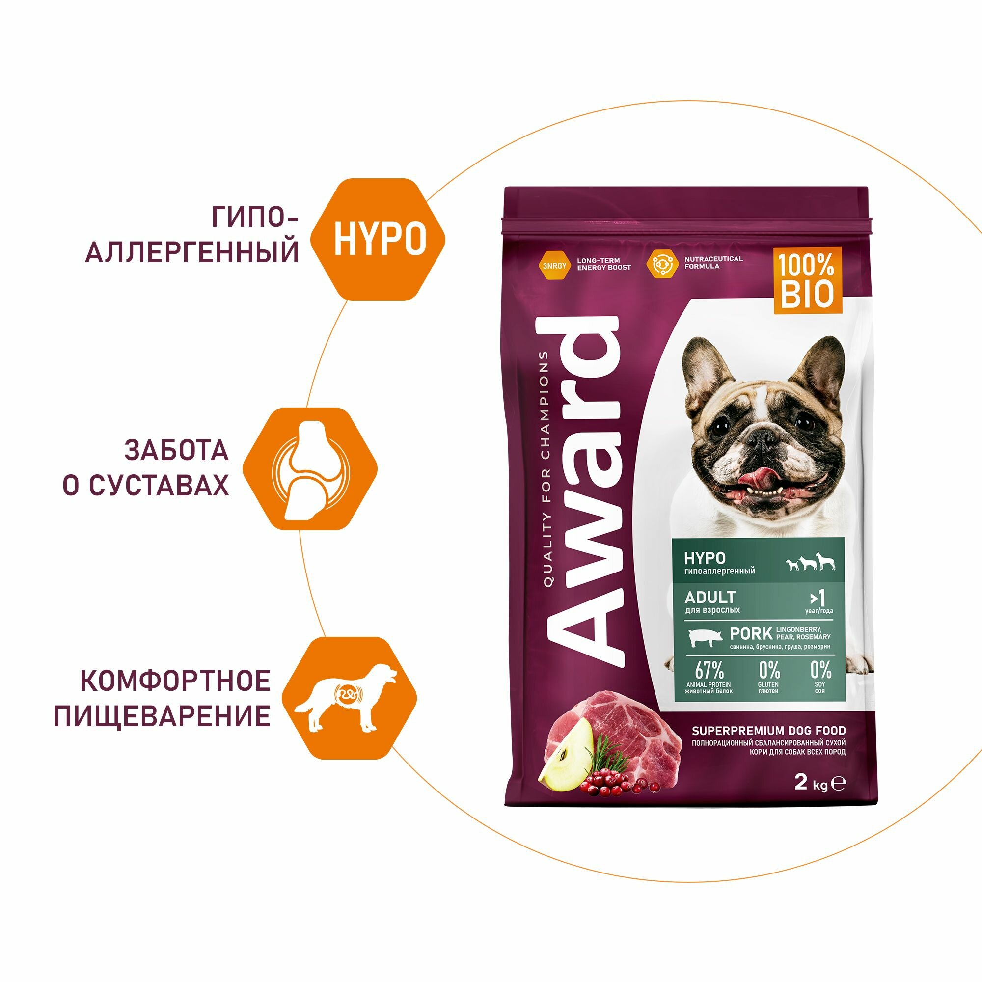 Корм для собак AWARD HYPO сухой корм для взрослых собак всех пород со свининой с добавлением брусники, груши и розмарина - 2 кг