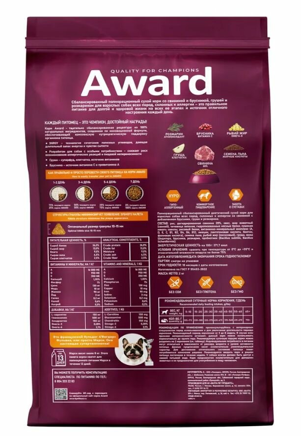 Корм для собак Сухой корм AWARD HYPO для взрослых собак всех пород со свининой с добавлением брусники, груши и розмарина 2 кг