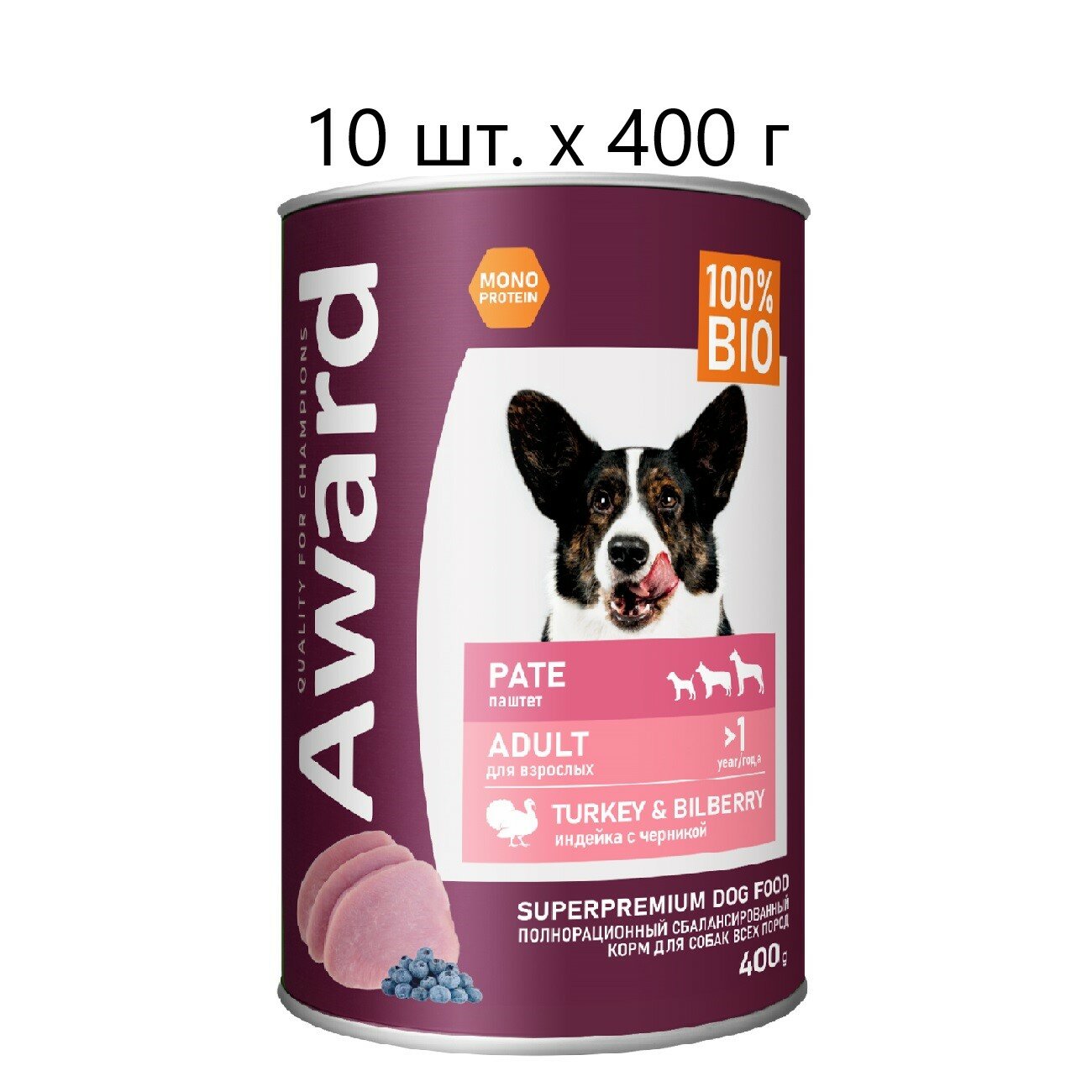 Корм для собак Влажный корм AWARD для взрослых собак паштет из индейки с черникой 400г х 10 шт.