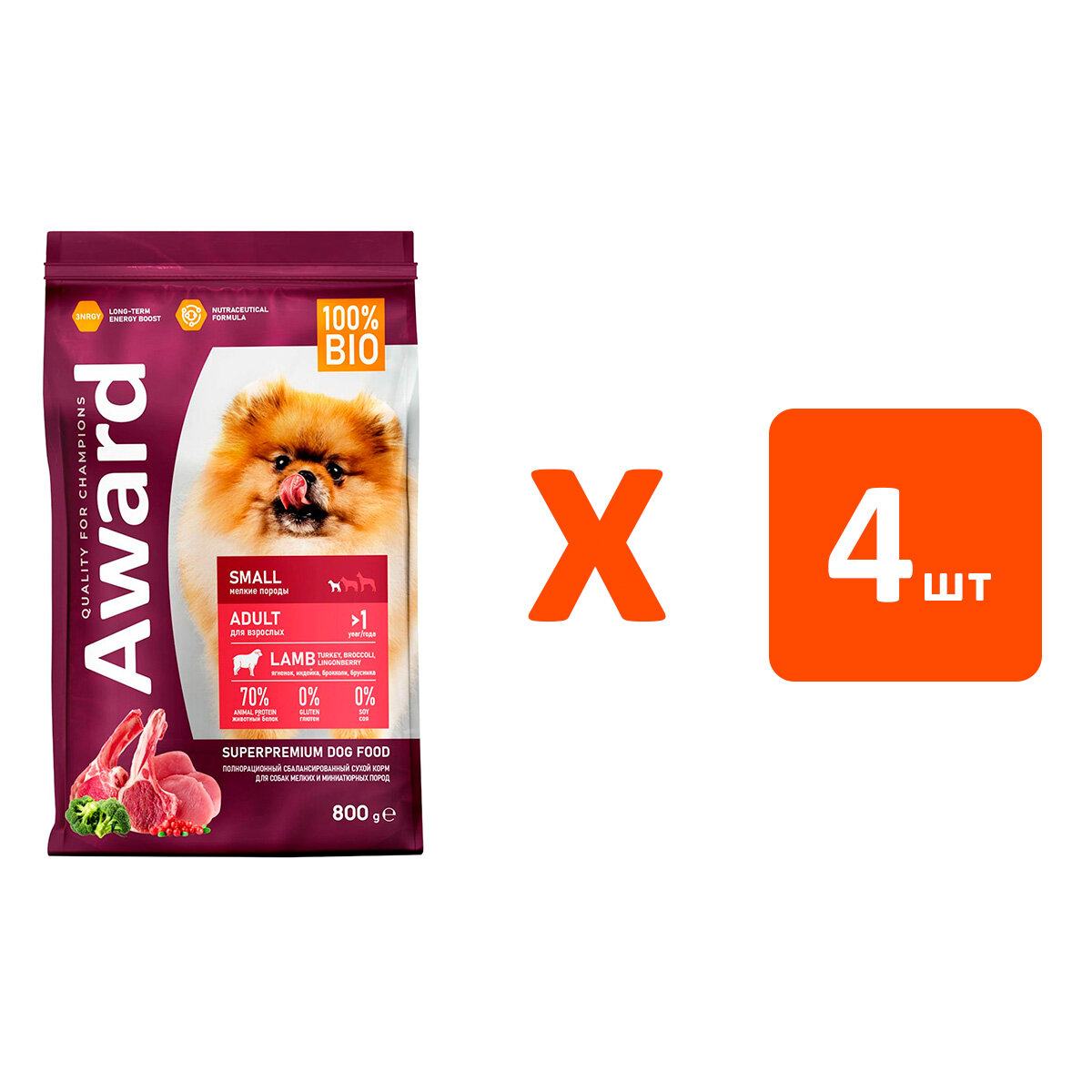 Корм для собак AWARD ADULT SMALL для взрослых собак маленьких пород с ягненком и индейкой 0,8 кг х 4 шт