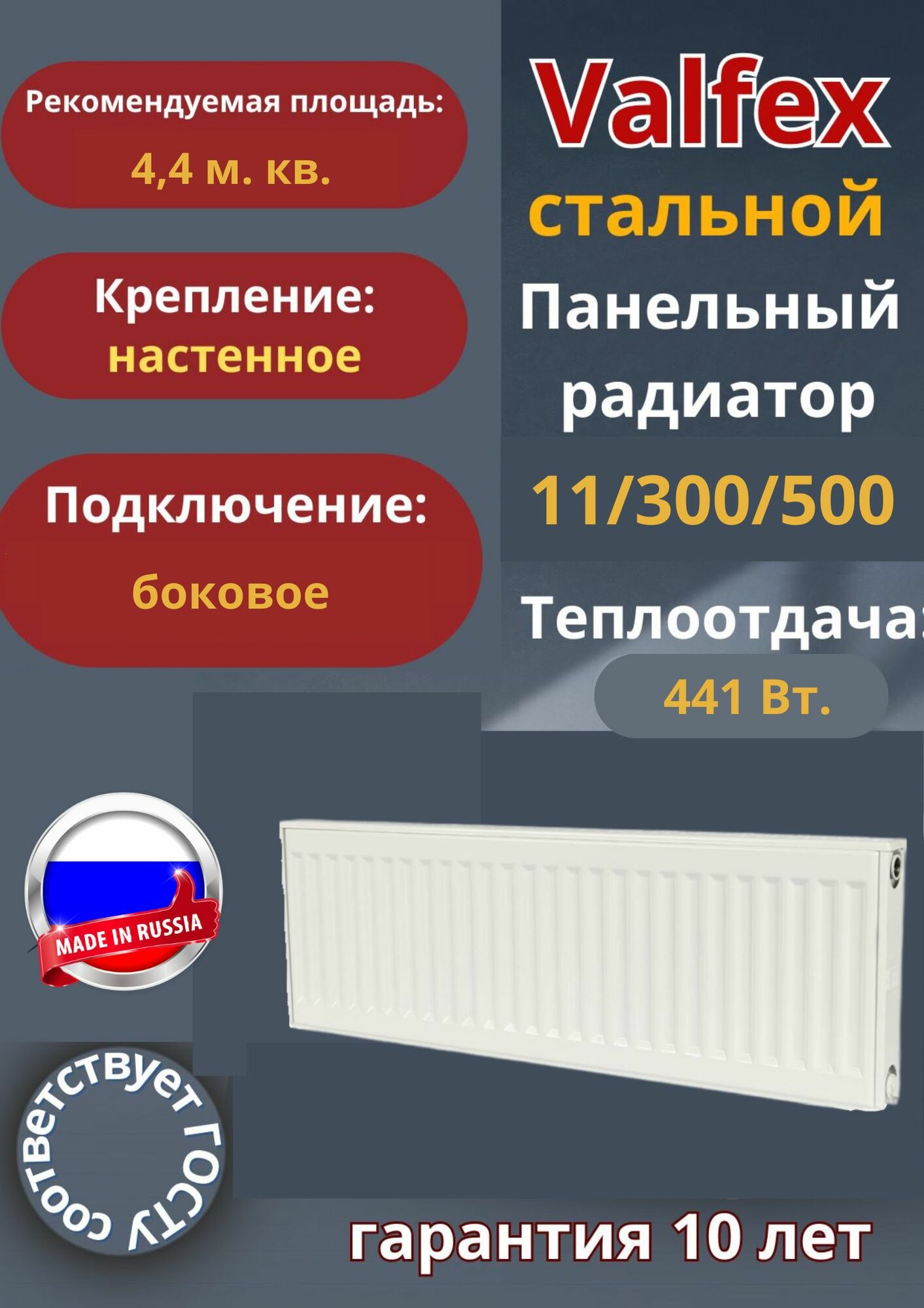 Радиаторы отопления Valfex, тип 11/Высота 300мм/Длина 500мм, боковое подключение, стальной панельный радиатор