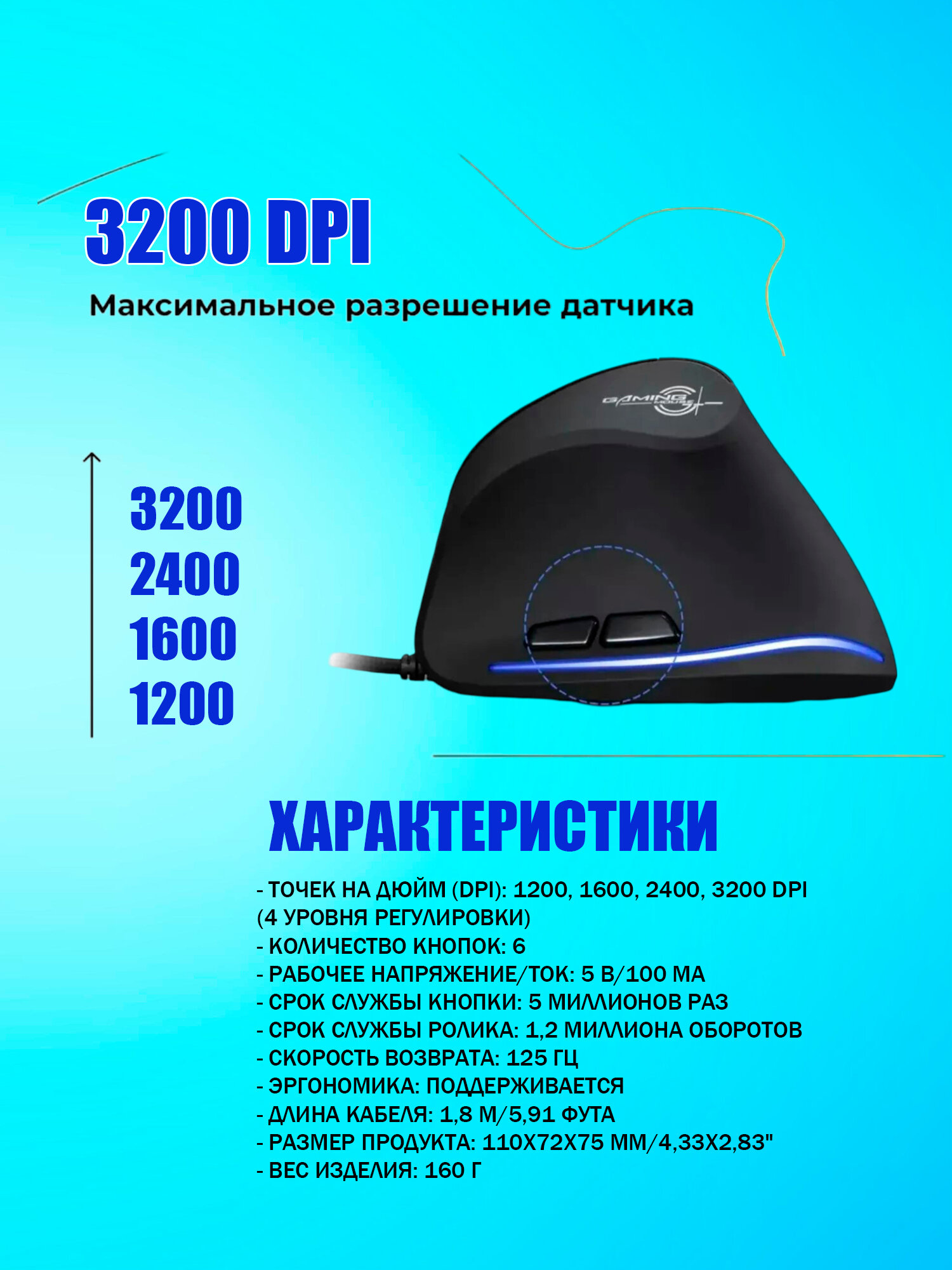| Разрешение сенсора | 800 – 1600 DPI |