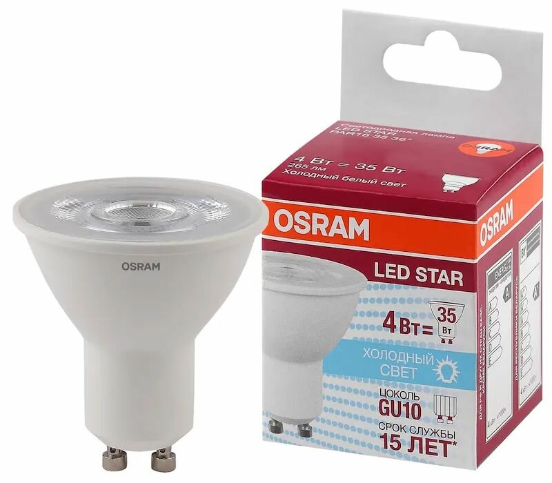 Лампа светодиодная OSRAM LED Star PAR16, 370лм, 4Вт, 6500К (холодный белый свет), Цоколь GU10, софит, 1 шт 509 ₽ Подробнее